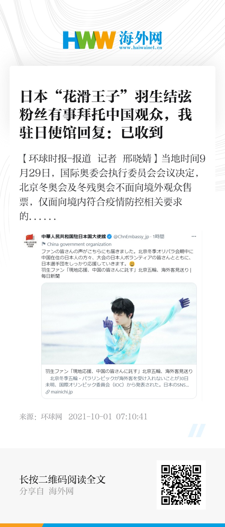 《环球时报》记者注意到,我驻日大使馆官方推特账号30日转发相关报道,并评论称,“收到粉丝的嘱托了。在北京冬奥会期间,将和住在中国的日本民众、参加大会的日本志愿者一起,为日本运动员加油”(如图)。