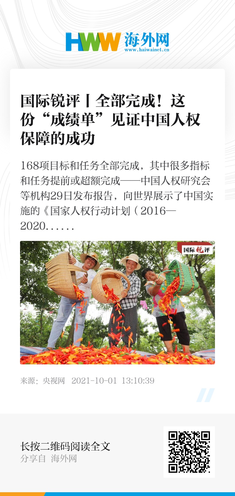 168项目标和任务全部完成,其中很多指标和任务提前或超额完成——中国人权研究会等机构29日发布报告,向世界展示了中国实施的《国家人权行动计划(2016—2020年)》的亮眼成绩。