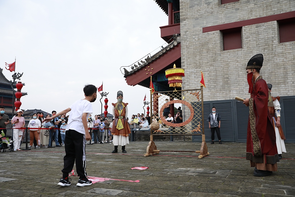 西安城墙上举办“大唐运动会” 游客体验蹴鞠游戏