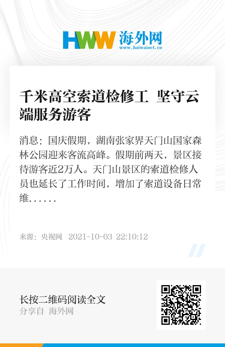央视网消息:国庆假期,湖南张家界天门山国家森林公园迎来客流高峰。假期前两天,景区接待游客近2万人。天门山景区的索道检修人员也延长了工作时间,增加了索道设备日常维护次数,坚守在千米高空,确保索道、游客安全。