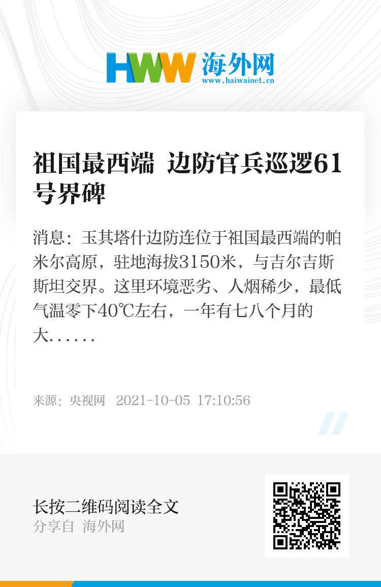 央视网消息:玉其塔什边防连位于祖国最西端的帕米尔高原,驻地海拔3150米,与吉尔吉斯斯坦交界。这里环境恶劣、人烟稀少,最低气温零下40℃左右,一年有七八个月的大雪封山期,素有“雪域孤岛”之称。