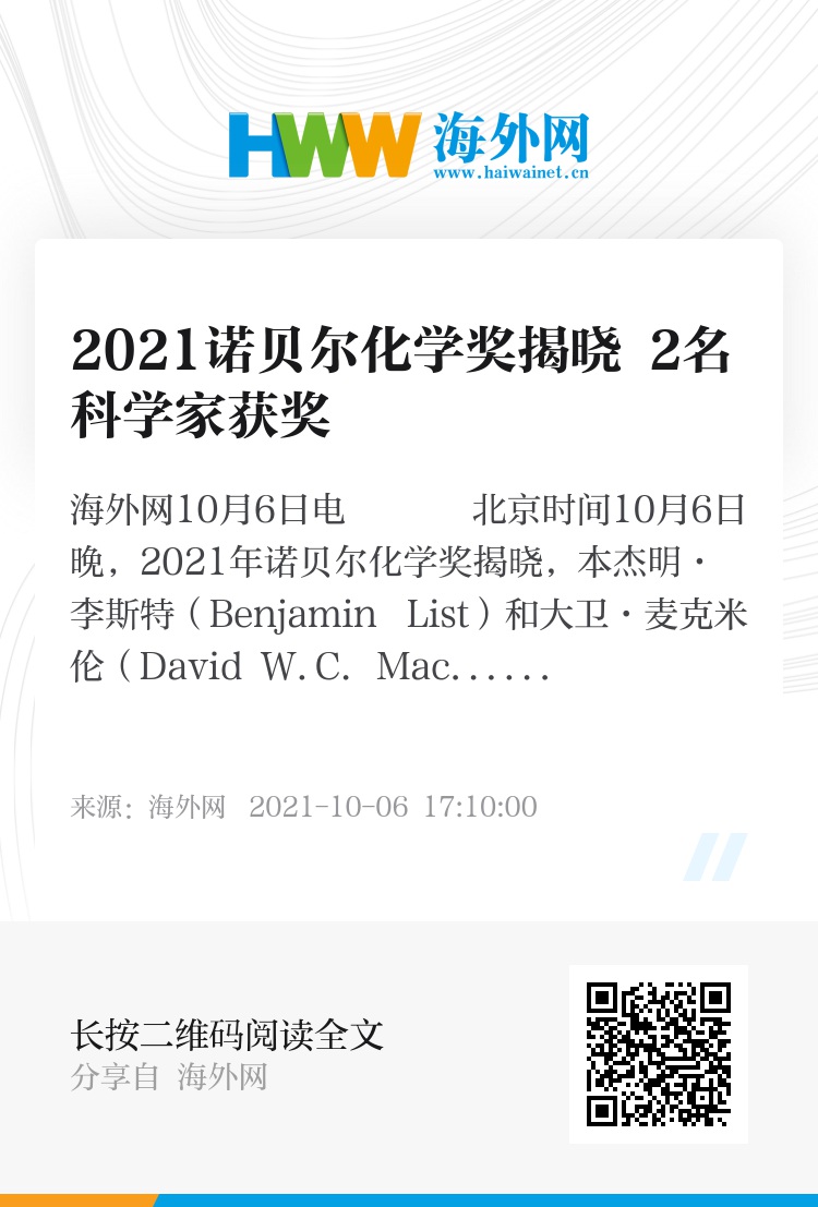 海外网10月6日电 北京时间10月6日晚,2021年诺贝尔化学奖揭晓,本杰明·李斯特(Benjamin List)和大卫·麦克米伦(David W.C. MacMillan)因在“不对称有机催化方面的发展”获得这一奖项。