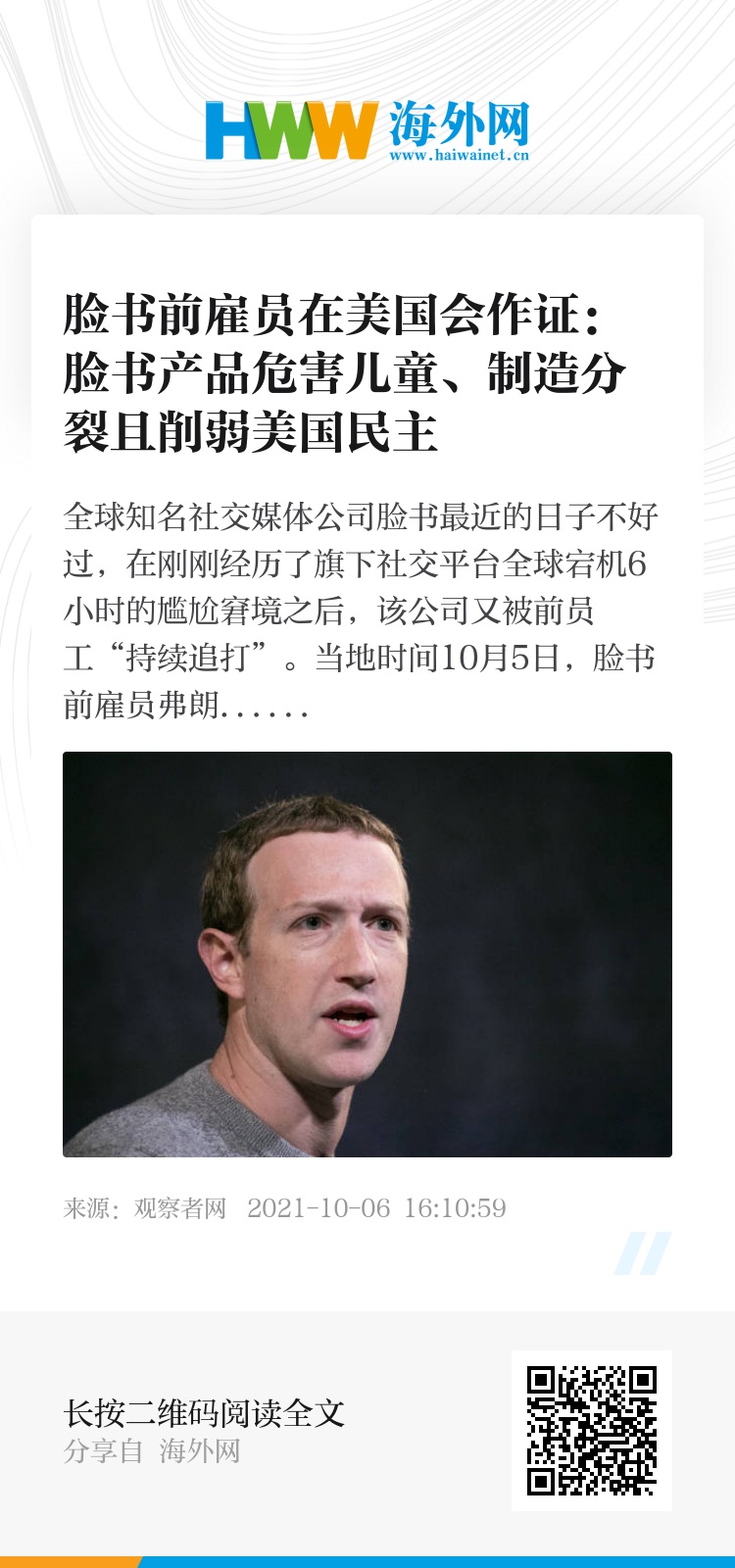 当地时间10月5日,脸书前雇员弗朗西丝・豪根(Frances Haugen),当天在参加美国国会参议院商务委员会下属消费者保护小组委员会的听证会时,请求国会对脸书采取行动,她指责脸书为追求“天文数字的利润”而故意将用户之于危险之中。
