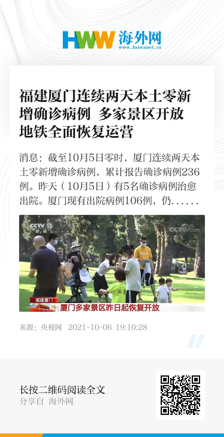 此外,自10月5日起,福建厦门市思明、湖里、集美、海沧、翔安区多数公园、景区等户外区域有序恢复开放。