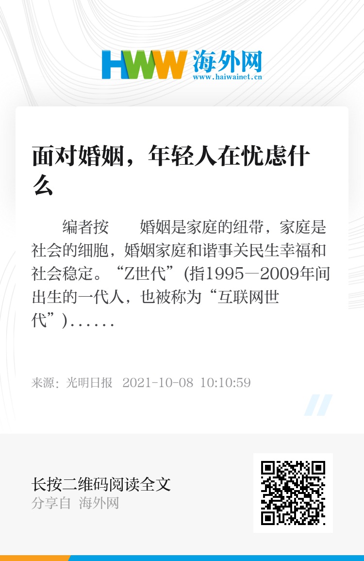 这样的催婚在许多家庭不断上演,成为两代人冲突的一大主题。这也反映出随着时代变迁,青年的婚恋态度已发生较大变化。出生于1995―2009年间的青年,作为“互联网世代”,他们的婚恋观是怎样的?面对婚姻,他们在忧虑什么?