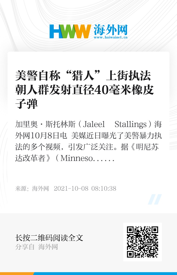 海外网10月8日电 美媒近日曝光了美警暴力执法的多个视频,引发广泛关注。据《明尼苏达改革者》(Minnesota Reformer)报道,其中一则视频拍摄于2020年5月30日,即遭警察“跪杀”的弗洛伊德死亡后的第5天。视频中,美国警察持枪在明尼阿波利斯街上执行宵禁令,期间用橡皮子弹对付上街的人,在子弹击中人群后,他们竟互相击掌庆祝。