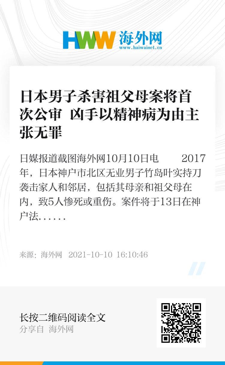 海外网10月10日电 2017年,日本神户市北区无业男子竹岛叶实持刀袭击家人和邻居,包括其母亲和祖父母在内,致5人惨死或重伤。案件将于13日在神户法院首次公审。相关人士称,竹岛将主张自己无罪,称犯罪时处于“心神丧失状态”。