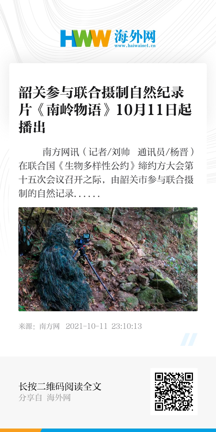 南方网讯(记者/刘帅 通讯员/杨晋)在联合国《生物多样性公约》缔约方大会第十五次会议召开之际,由韶关市参与联合摄制的自然记录片——《南岭物语》,10月11日开始在广东卫视和腾讯视频纪录片频道同步播出。