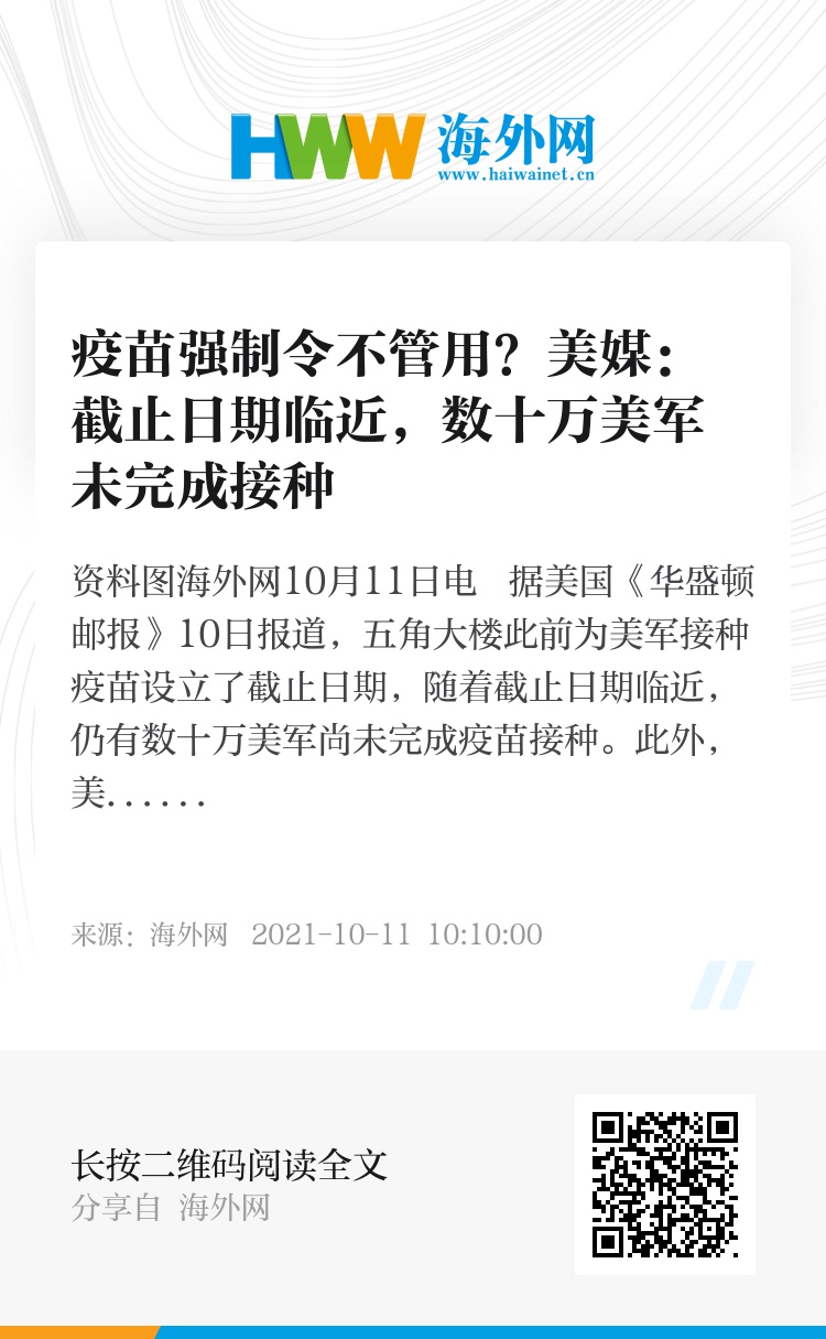 海外网10月11日电 据美国《华盛顿邮报》10日报道,五角大楼此前为美军接种疫苗设立了截止日期,随着截止日期临近,仍有数十万美军尚未完成疫苗接种。此外,美军各军种疫苗接种的比例失衡,预备役军人死亡人数激增。美媒认为,这表明政治分歧渗透到了有明确命令的无党派力量中。