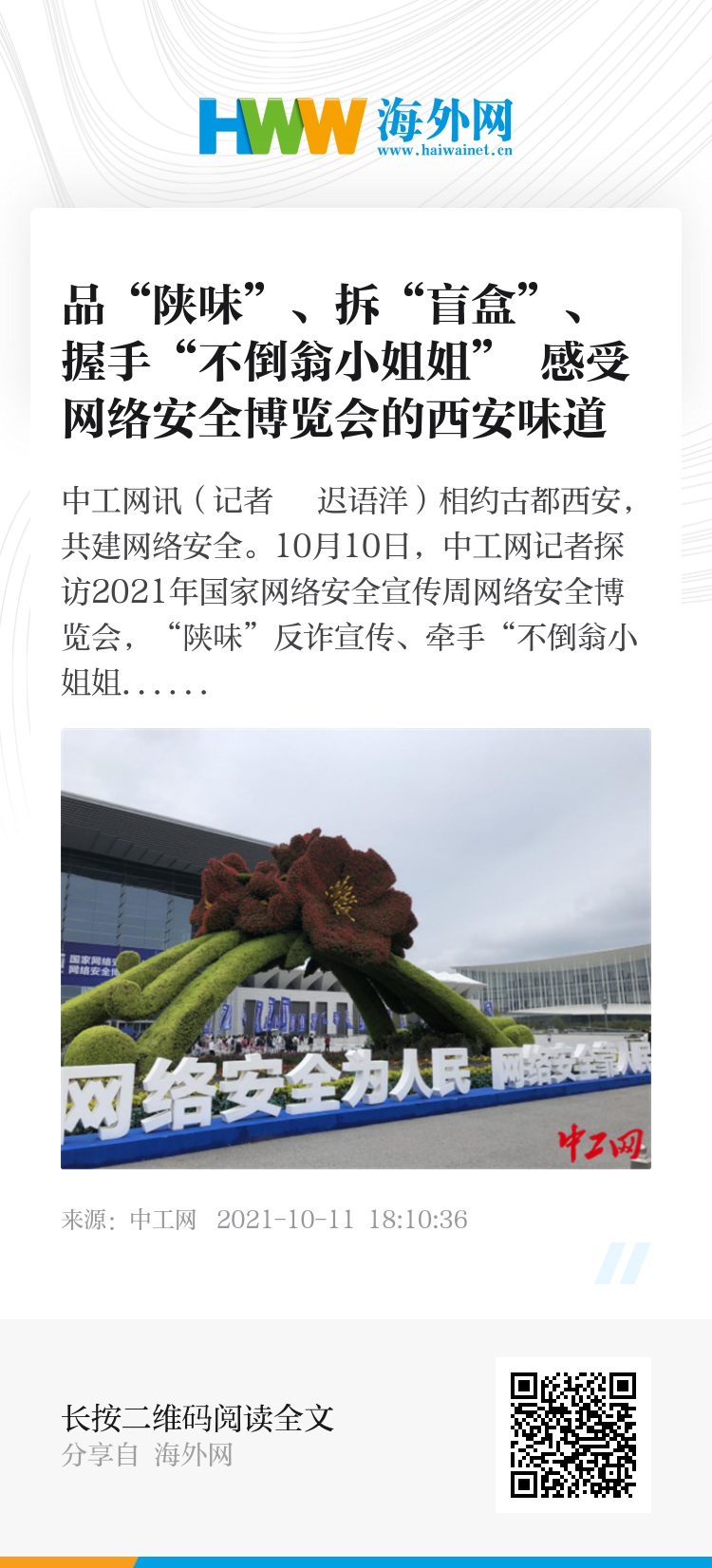 中工网讯(记者 迟语洋)相约古都西安,共建网络安全。10月10日,中工网记者探访2021年国家网络安全宣传周网络安全博览会,“陕味”反诈宣传、牵手“不倒翁小姐姐”、体验交互式“反诈盲盒”、打卡式网络安全科普“通关文牒”……这届网络安全博览会处处透着西安味道,让人不禁感叹“嘹咂咧”!