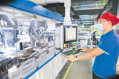 安徽大恒能源科技有限公司今年投资6000万元新增2条全自动化生产线,用于生产创新专利产品“全面屏组件”“低电流组件”以及全球首创的微单元智能光伏系统等。图为工人正在操作自动串焊机。 赵 明摄(人民视觉)