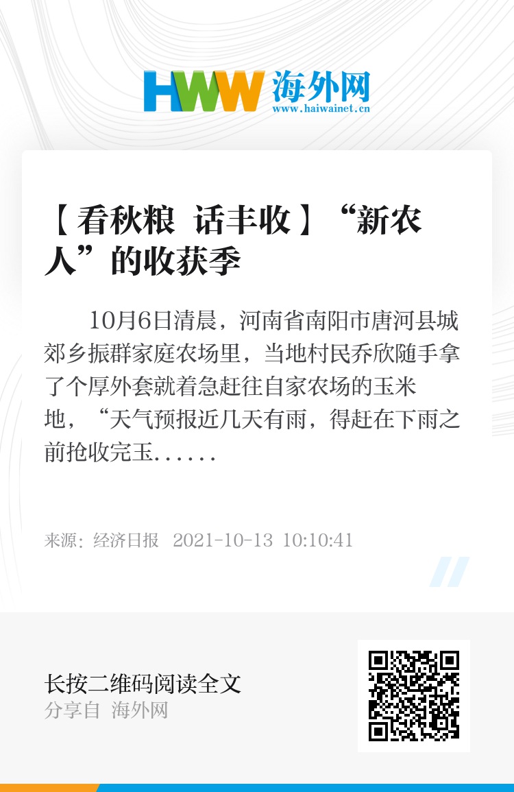 10月6日清晨,河南省南阳市唐河县城郊乡振群家庭农场里,当地村民乔欣随手拿了个厚外套就着急赶往自家农场的玉米地,“天气预报近几天有雨,得赶在下雨之前抢收完玉米”。对于乔欣来说,国庆长假也只是农忙时节再普通不过的一天。
