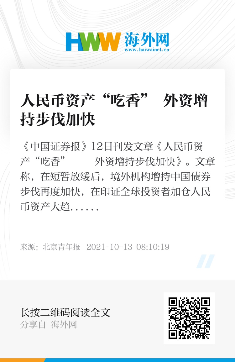 《中国证券报》12日刊发文章《人民币资产“吃香” 外资增持步伐加快》。文章称,在短暂放缓后,境外机构增持中国债券步伐再度加快,在印证全球投资者加仓人民币资产大趋势不变的同时,反映出其对中国经济的信心。