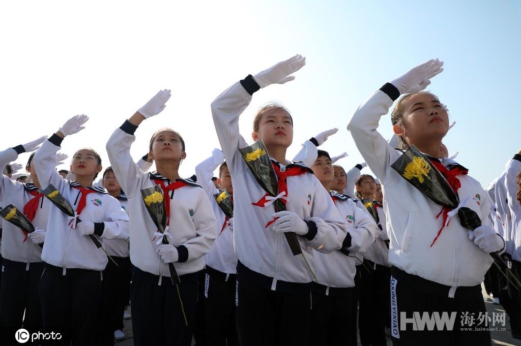 2021年9月30日,在山东省滨州市博兴县烈士陵园,少先队员向革命烈士纪念碑敬队礼。(供图:东方IC)