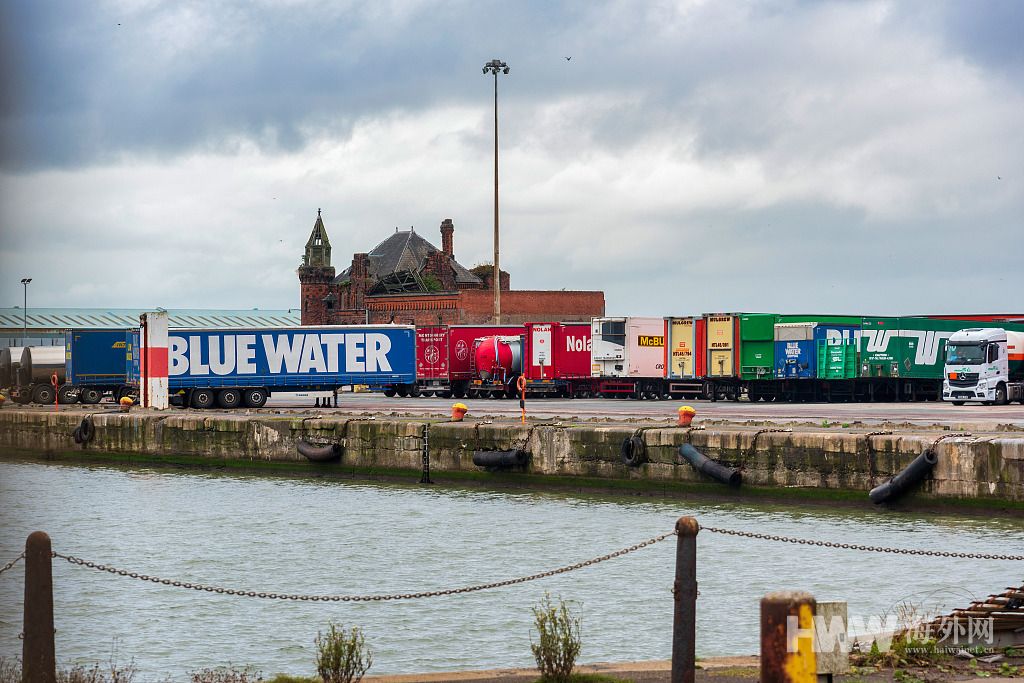 当地时间2021年10月13日,英国利物浦,利物浦港口的货车。英国卡车司机短缺问题已持续数月。据英国《镜报》10日报道,由于卡车司机短缺,一些公路货运商开出多至7.8万英镑的年薪招工,远高于公交司机3.25万英镑的年均收入水平,一些公交司机因此跳槽,致使部分主要公交线路人手不足甚至无法运行。一些公交公司被迫减少发车频次,以尽量保障主要通勤线路和上学线路的公交车运行。(供图:视觉中国)