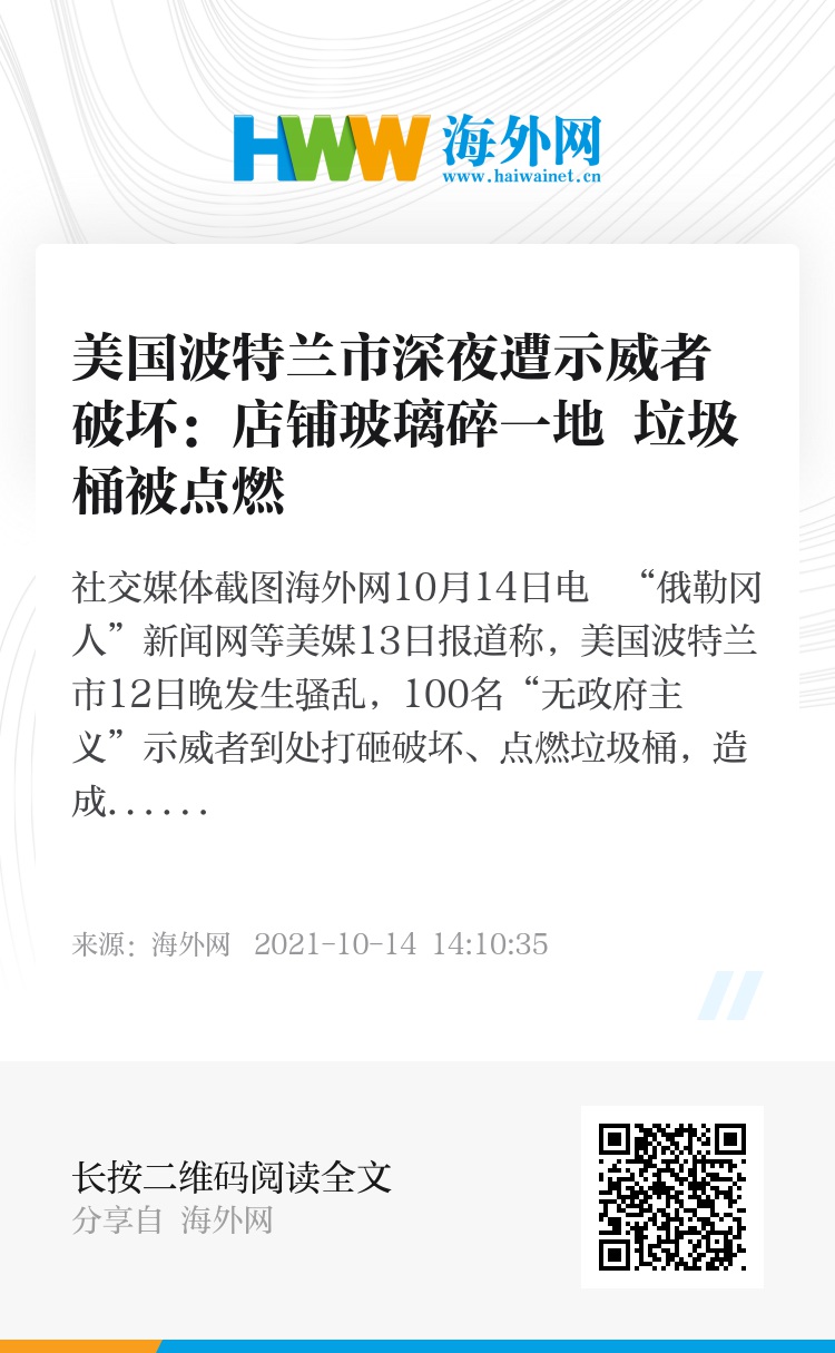海外网10月14日电 “俄勒冈人”新闻网等美媒13日报道称,美国波特兰市12日晚发生骚乱,100名“无政府主义”示威者到处打砸破坏、点燃垃圾桶,造成35个地点的建筑受损,经济损失超50万美元。