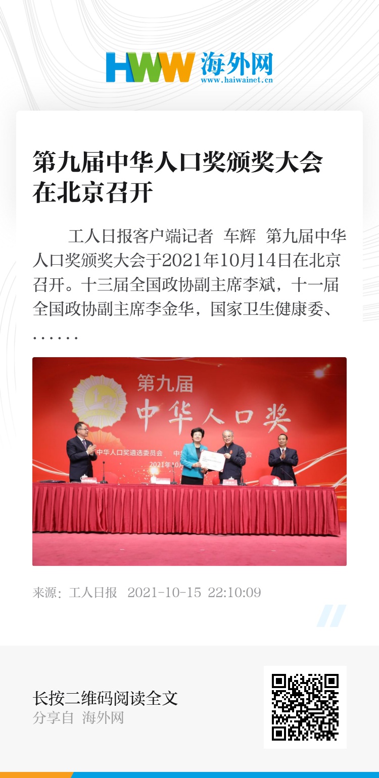 工人日报客户端记者 车辉 第九届中华人口奖颁奖大会于2021年10月14日在北京召开。十三届全国政协副主席李斌,十一届全国政协副主席李金华,国家卫生健康委、科技部、教育部、国家统计局、全国妇联、人口学会、中国计划生育协会、中国人口福利基金会等单位负责同志出席大会,会议由国家卫生健康委员会副主任、第九届中华人口奖遴选委员会委员、组织工作委员会主任于学军主持。