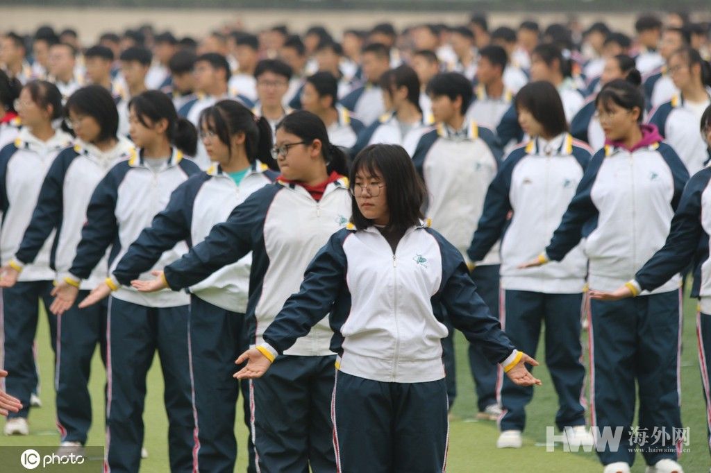 2021年10月15日,山东省邹城市第一中学举行秋季运动会,高二全体千余名学生齐练太极八段锦,整齐划一,动作到位,甚是壮观。(供图:东方IC)