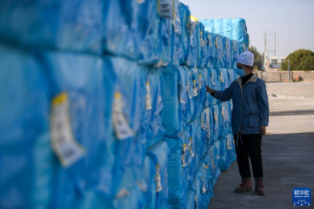 在尉犁县众望纺织有限公司,工作人员查看刚加工完的皮棉(10月14日摄)。新华社记者 赵戈 摄