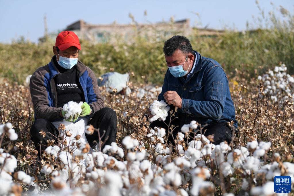 10月15日,尉犁县古勒巴格乡巴西买里村棉农尔肯·热衣木(右)和拾花工在棉田交流。尔肯·热衣木为拾花工开出每公斤2.5元的手工费,一名熟练的拾花工每天收入超过200元。新华社记者 赵戈 摄