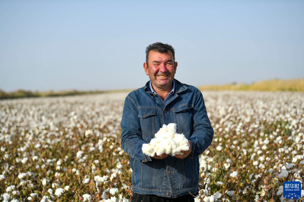 10月15日,尉犁县古勒巴格乡巴西买里村棉农尔肯·热衣木在展示自己种植的新鲜棉花。新华社记者 赵戈 摄