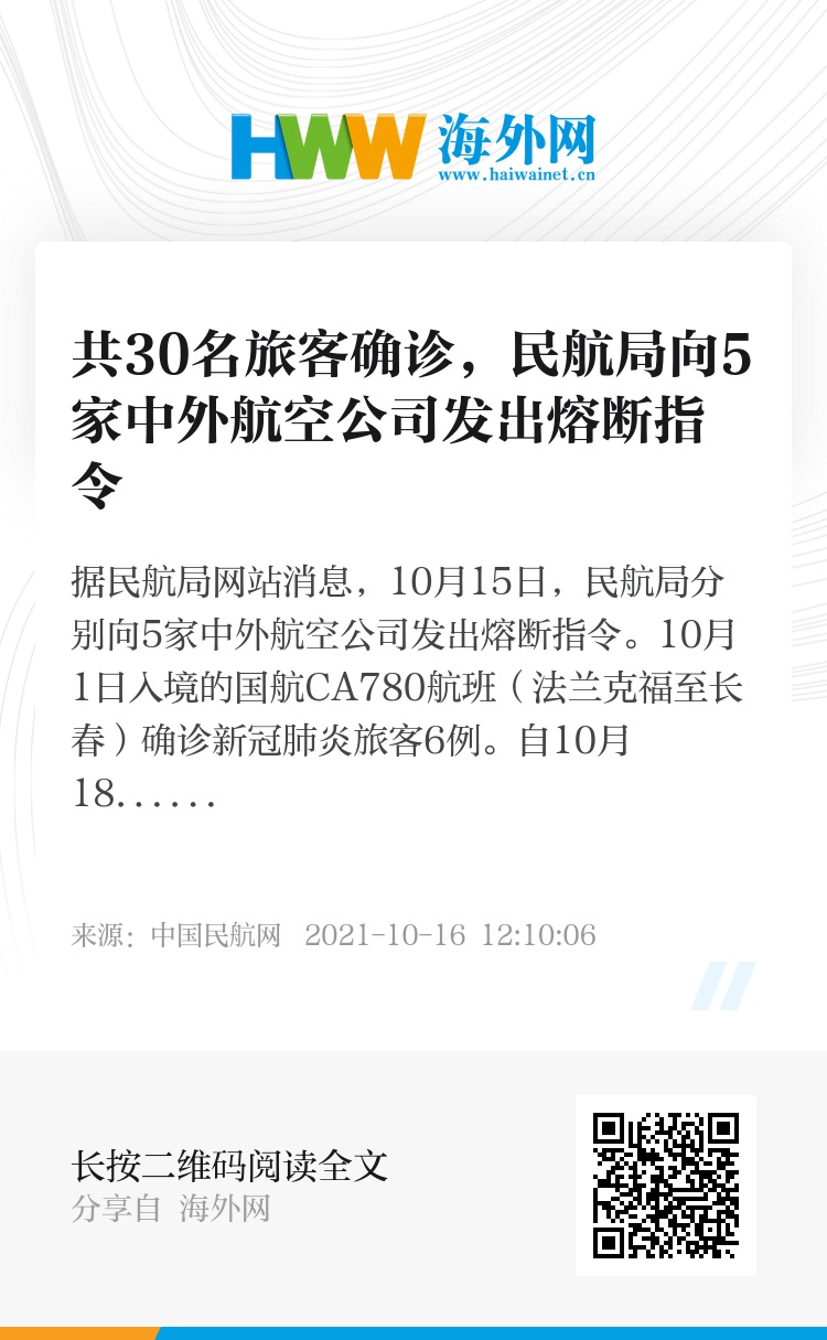 10月1日入境的国航CA780航班(法兰克福至长春)确诊新冠肺炎旅客6例。自10月18日起,暂停该航班运行2班。10月1日入境的山航SC4088航班(首尔至青岛)确诊新冠肺炎旅客5例。鉴于SC4708航班系SC4088航班的奖励航班,自10月18起,暂停SC4088航班(首尔至青岛)运行2班,取消奖励航班SC4708(首尔至烟台)。熔断的航班量均不得用于其他航线。