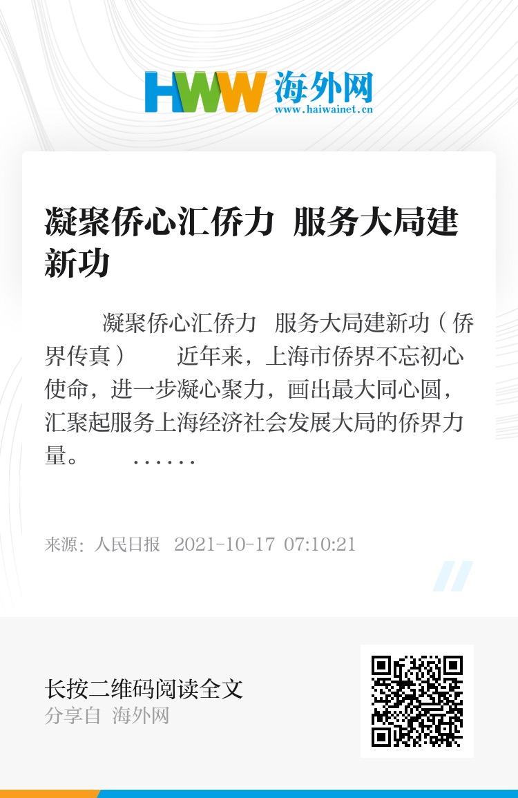 近年来,上海市侨界不忘初心使命,进一步凝心聚力,画出最大同心圆,汇聚起服务上海经济社会发展大局的侨界力量。
