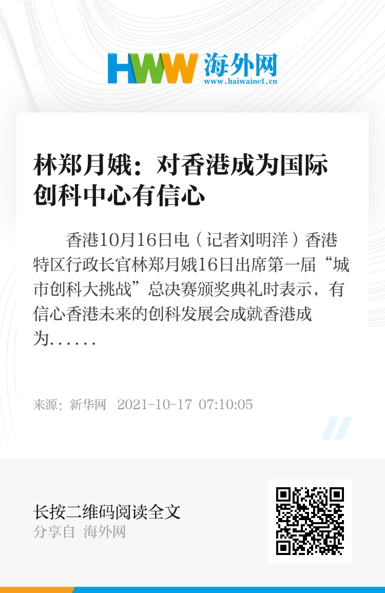 新华社香港10月16日电(记者刘明洋)香港特区行政长官林郑月娥16日出席第一届“城市创科大挑战”总决赛颁奖典礼时表示,有信心香港未来的创科发展会成就香港成为国际创新科技中心,与国际金融中心地位并驾齐驱。