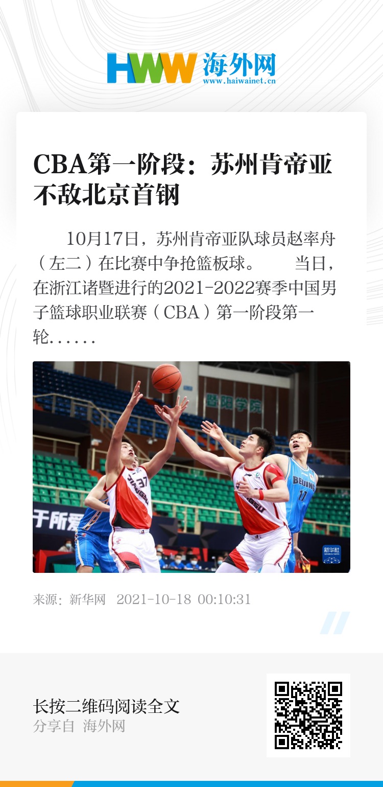 当日,在浙江诸暨进行的2021-2022赛季中国男子篮球职业联赛(CBA)第一阶段第一轮比赛中,苏州肯帝亚队以71比87不敌北京首钢队。