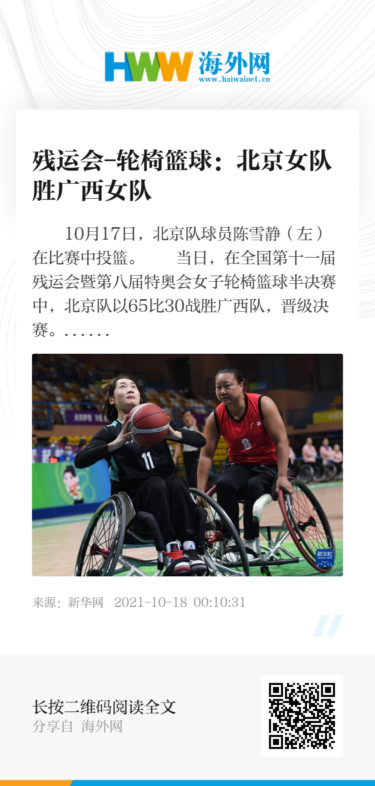 当日,在全国第十一届残运会暨第八届特奥会女子轮椅篮球半决赛中,北京队以65比30战胜广西队,晋级决赛。