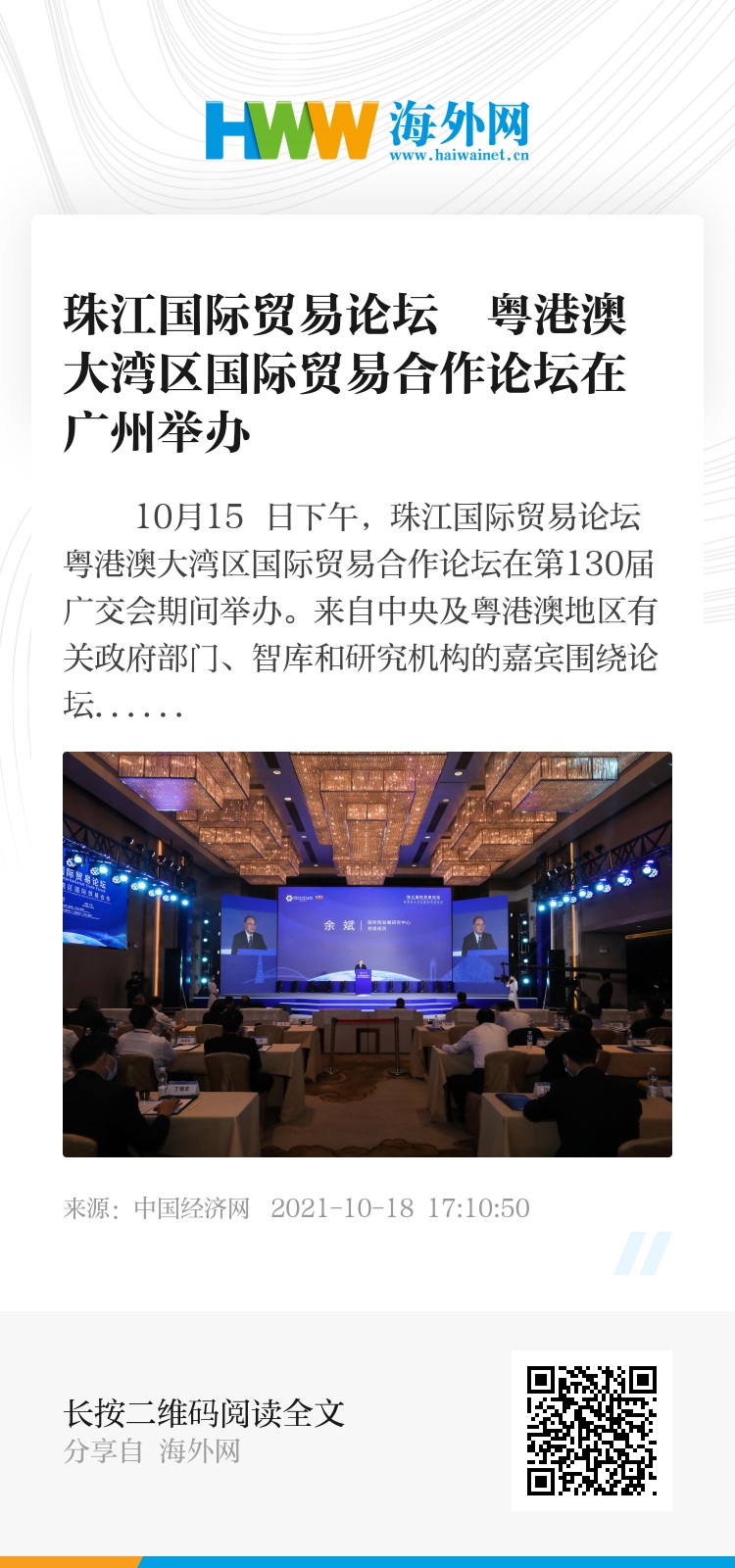 10月15 日下午,珠江国际贸易论坛・粤港澳大湾区国际贸易合作论坛在第130届广交会期间举办。来自中央及粤港澳地区有关政府部门、智库和研究机构的嘉宾围绕论坛主题进行了深入讨论,为粤港澳大湾区国际贸易合作贡献智慧。