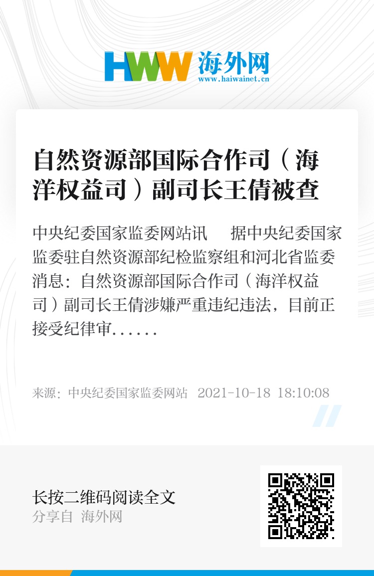中央纪委国家监委网站讯 据中央纪委国家监委驻自然资源部纪检监察组和河北省监委消息:自然资源部国际合作司(海洋权益司)副司长王倩涉嫌严重违纪违法,目前正接受纪律审查和监察调查。
