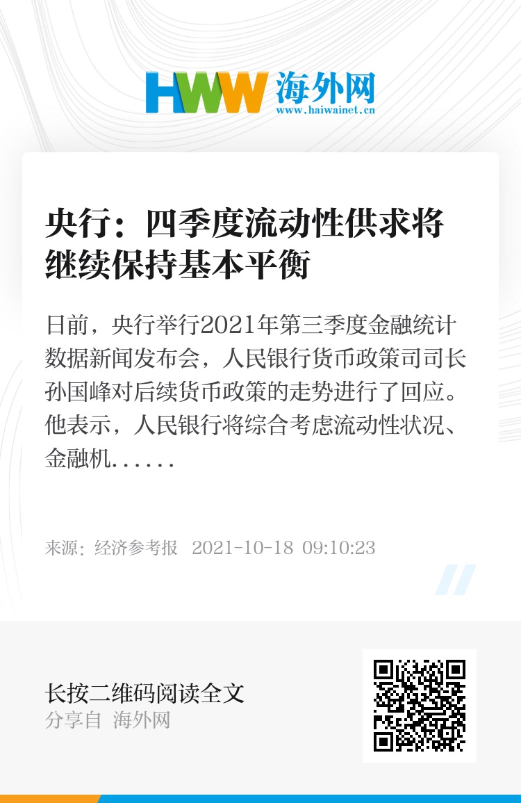 日前,央行举行2021年第三季度金融统计数据新闻发布会,人民银行货币政策司司长孙国峰对后续货币政策的走势进行了回应。他表示,人民银行将综合考虑流动性状况、金融机构需求等情况,灵活运用中期借贷便利、公开市场操作等多种货币政策工具,适时适度投放不同期限流动性,熨平短期波动,满足金融机构合理的资金需求,保持流动性合理充裕。