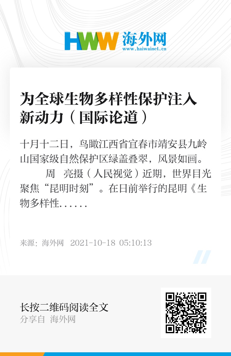 在日前举行的昆明《生物多样性公约》第十五次缔约方大会(COP15)上,中国同140多个缔约方及30多个国际机构和组织通过线上线下结合的方式,商讨生物多样性保护的务实行动,探索全球生物多样性治理的新战略。多家外媒与多国人士表示,中国生态治理成就令世界瞩目,中国保护生物多样性的努力令人振奋。未来,中国保护生物多样性的新举措,还将继续引领全球生态治理实践。