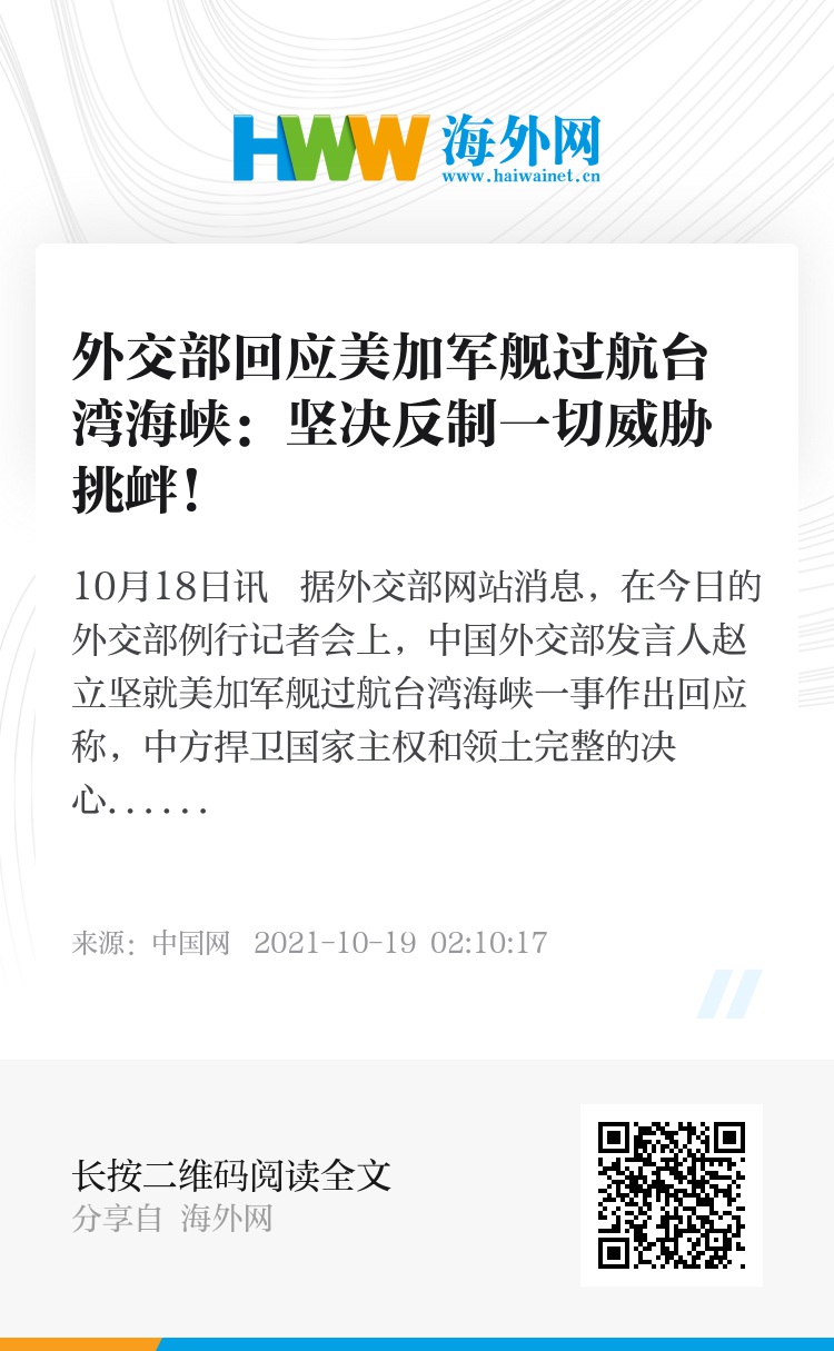 中国网10月18日讯 据外交部网站消息,在今日的外交部例行记者会上,中国外交部发言人赵立坚就美加军舰过航台湾海峡一事作出回应称,中方捍卫国家主权和领土完整的决心坚定不移。中国军队时刻保持高度戒备,坚决反制一切威胁挑衅。
