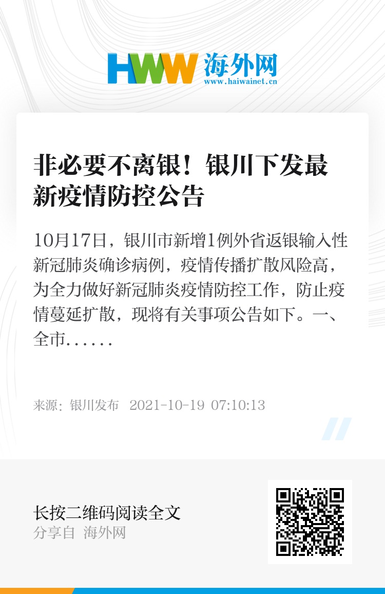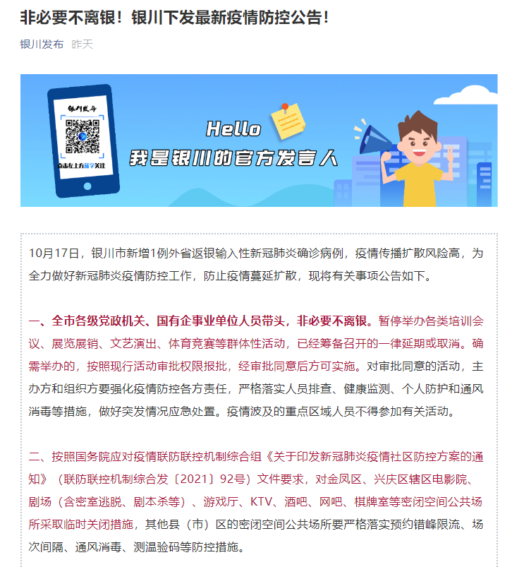 10月17日,银川市新增1例外省返银输入性新冠肺炎确诊病例,疫情传播扩散风险高,为全力做好新冠肺炎疫情防控工作,防止疫情蔓延扩散,现将有关事项公告如下。