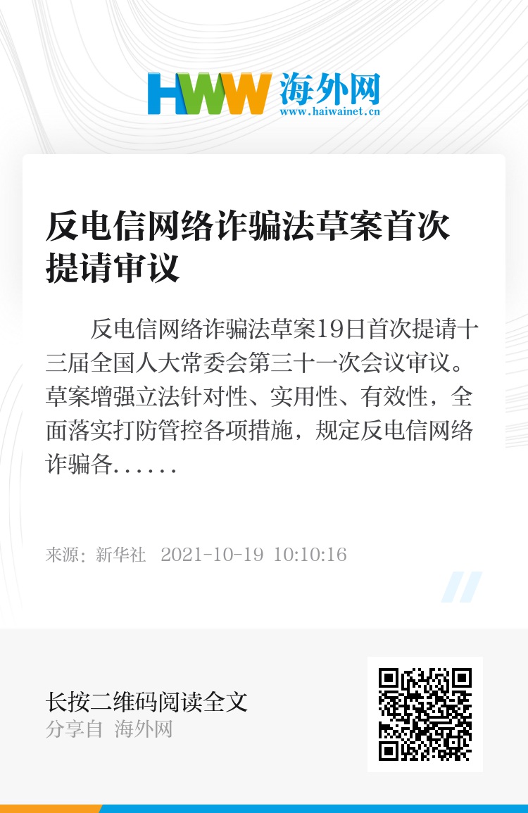 反电信网络诈骗法草案19日首次提请十三届全国人大常委会第三十一次会议审议。草案增强立法针对性、实用性、有效性,全面落实打防管控各项措施,规定反电信网络诈骗各部门职责、企业职责和地方政府职责;落实实名制,规定电话卡、互联网服务真实信息登记制度;加大惩处非法买卖、出租、出借电话卡、物联网卡、金融账户、互联网账号行为;建立涉案资金紧急止付、快速冻结和资金返还制度;对潜在受害人预警劝阻和开展被害人救助等。(记者熊丰)
