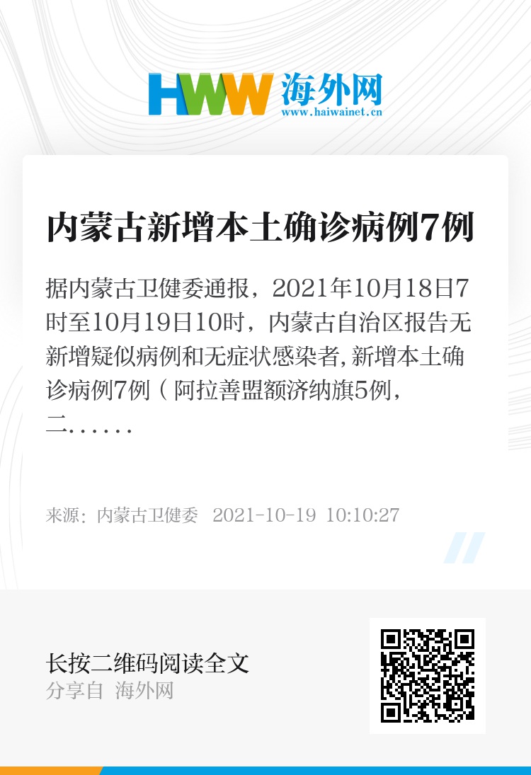 据内蒙古卫健委通报,2021年10月18日7时至10月19日10时,内蒙古自治区报告无新增疑似病例和无症状感染者,新增本土确诊病例7例(阿拉善盟额济纳旗5例,二连浩特市2例)。