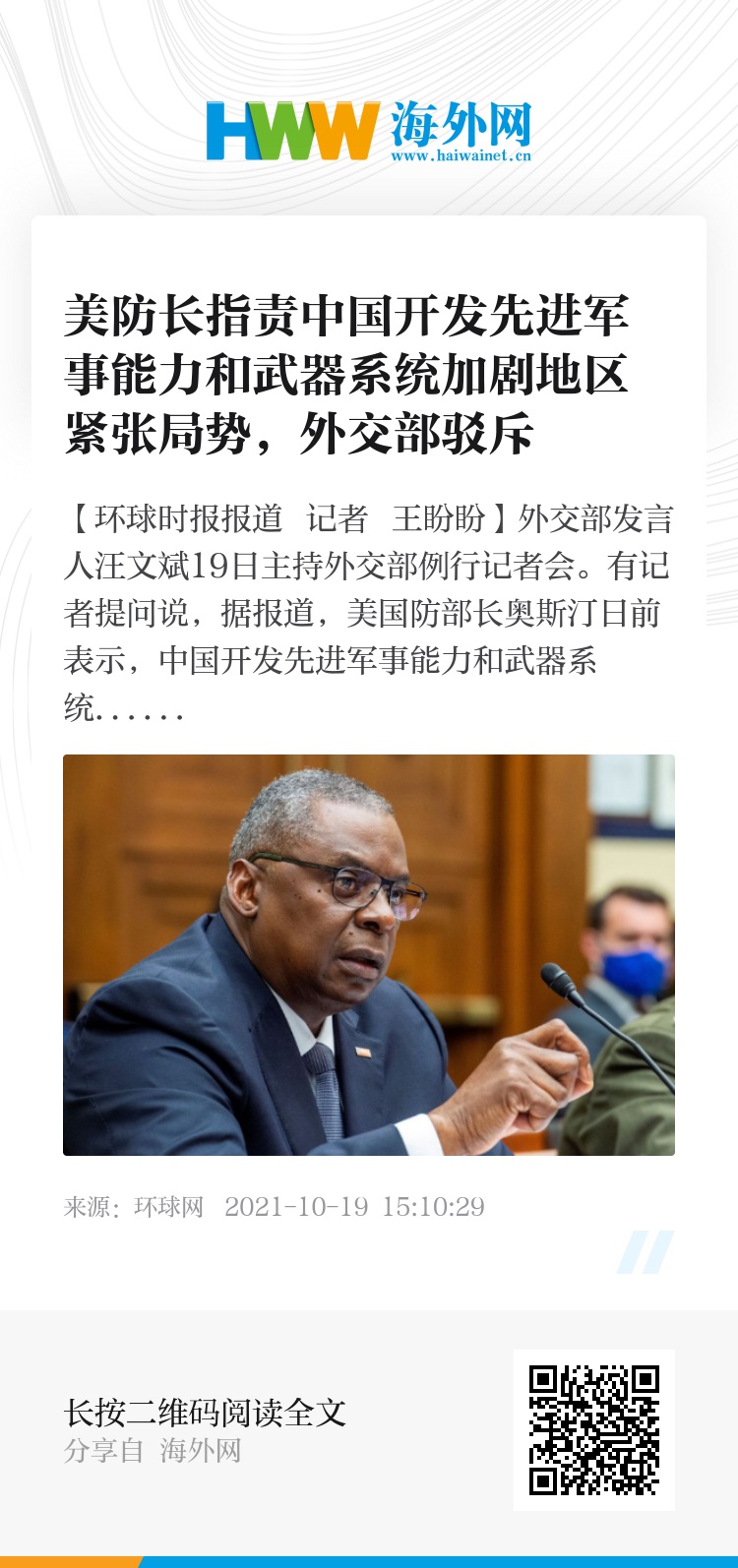 【环球时报环球网报道 记者 王盼盼】外交部发言人汪文斌19日主持外交部例行记者会。有记者提问说,据报道,美国防部长奥斯汀日前表示,中国开发先进军事能力和武器系统,只会加剧地区紧张局势。美裁军大使也称,中俄正积极推进高超音速技术运用和军事化,这将加剧军备竞赛。请问中方对此有何评论?谢谢。