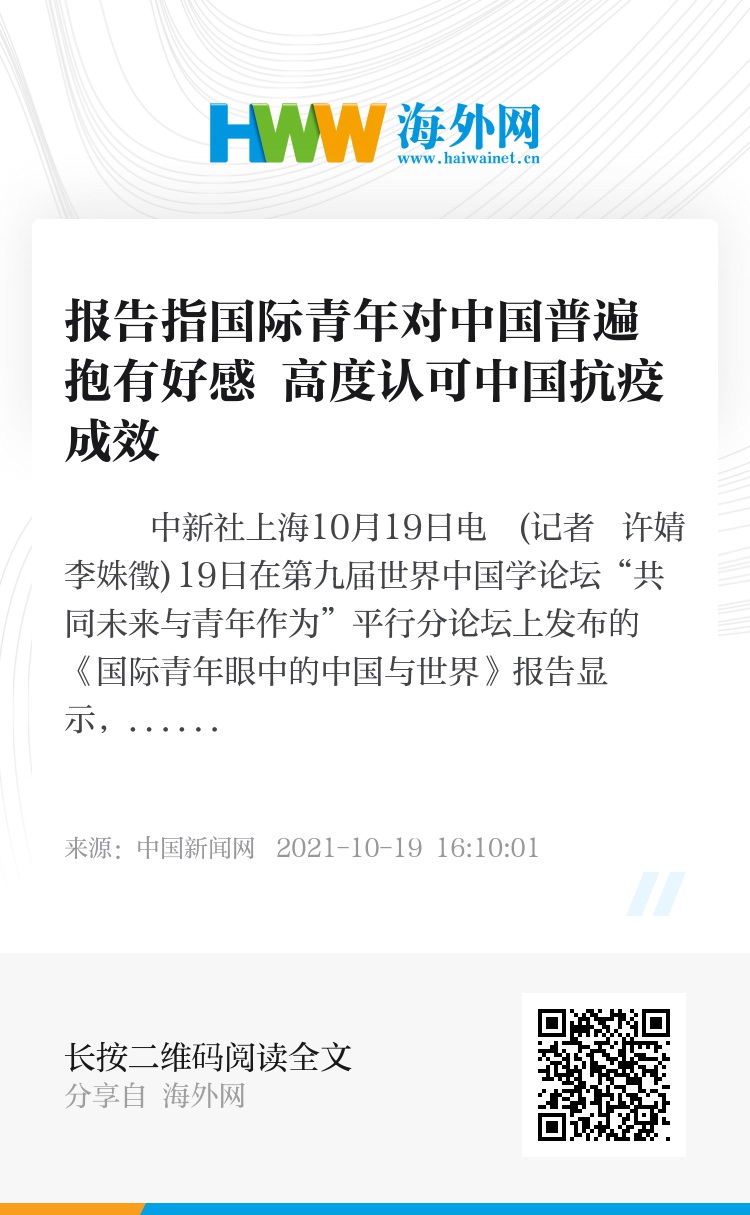 中新社上海10月19日电 (记者 许婧 李姝徵)19日在第九届世界中国学论坛“共同未来与青年作为”平行分论坛上发布的《国际青年眼中的中国与世界》报告显示,国际青年特别是发展中国家青年对中国普遍抱有好感,具有较高的来华意愿,高度认可中国抗疫成效。