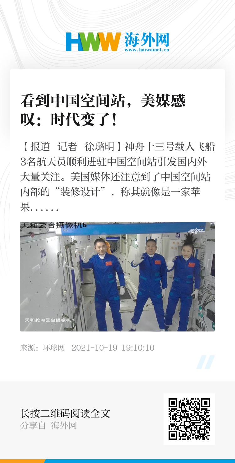 【环球网报道 记者 徐璐明】神舟十三号载人飞船3名航天员顺利进驻中国空间站引发国内外大量关注。美国媒体还注意到了中国空间站内部的“装修设计”,称其就像是一家苹果商店。在将中国空间站与国际空间站对比后,美媒还感叹说“现在时代变了”。
