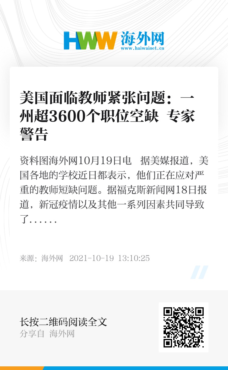 海外网10月19日电 据美媒报道,美国各地的学校近日都表示,他们正在应对严重的教师短缺问题。