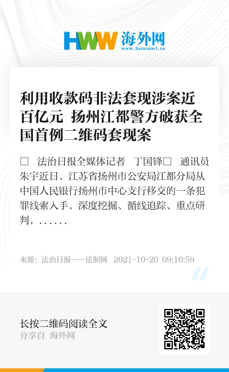 近日,江苏省扬州市公安局江都分局从中国人民银行扬州市中心支行移交的一条犯罪线索入手,深度挖掘、循线追踪、重点研判,成功破获一起特大非法经营案,抓获犯罪嫌疑人15名,梳理涉案资金近百亿元。据悉,该案是全国首例利用商户收款码非法套现的案件。