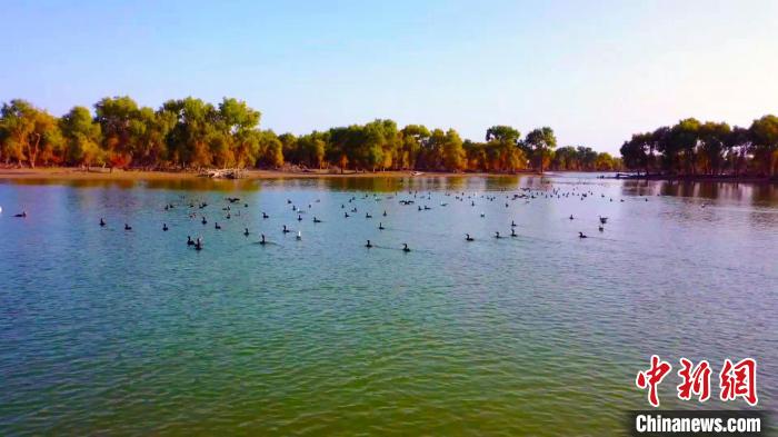 中新网乌鲁木齐10月20日电 (王小军 刘雨珊 吐尔逊·吾斯曼)10月,位于新疆巴州轮台县的塔里木胡杨林国家森林公园100余平方公里的原始胡杨林迎来最佳观赏季,金色胡杨与蓝天、大漠、水鸟、湖泊交相辉映。
