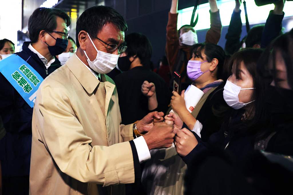 当地时间10月19日,日本东京,前外相河野太郎在东京进行竞选活动。图片来源:人民视觉