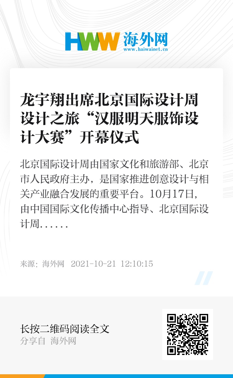 北京国际设计周由国家文化和旅游部、北京市人民政府主办,是国家推进创意设计与相关产业融合发展的重要平台。10月17日, 由中国国际文化传播中心指导、北京国际设计周有限公司和北京信远福缘发展集团有限公司联合承办的北京国际设计周设计之旅“汉服明天服饰设计大赛”在北京市密云区开幕。中国国际文化传播中心执行主席龙宇翔出席开幕式并致辞。