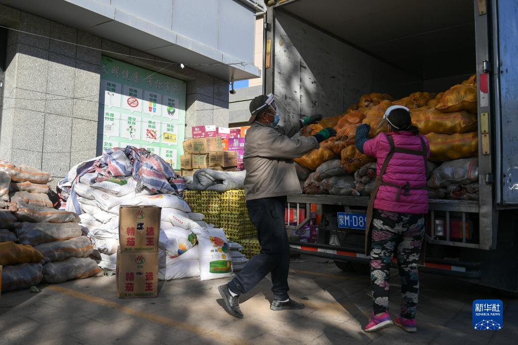10月20日,在阿拉善盟额济纳旗达来呼布镇民族生活超市外,超市员工在搬运物资。新华社记者 贝赫 摄