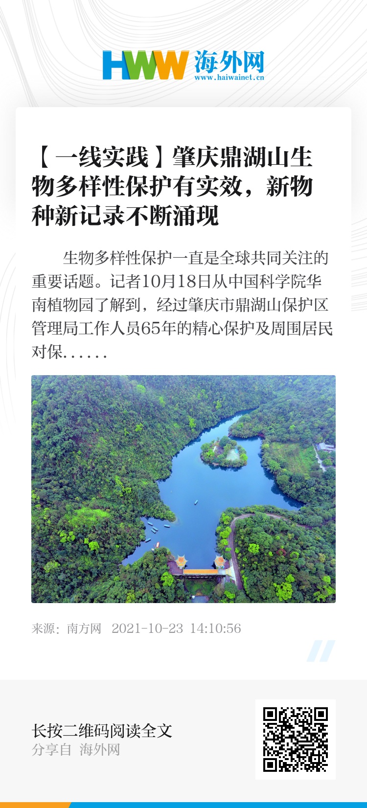 生物多样性保护一直是全球共同关注的重要话题。记者10月18日从中国科学院华南植物园了解到,经过肇庆市鼎湖山保护区管理局工作人员65年的精心保护及周围居民对保护工作的配合,鼎湖山森林覆盖率长期保持在98%以上,主要保护对象——季风常绿阔叶林面积增加50%,这里物种多样性富集度高,新物种新记录不断涌现。