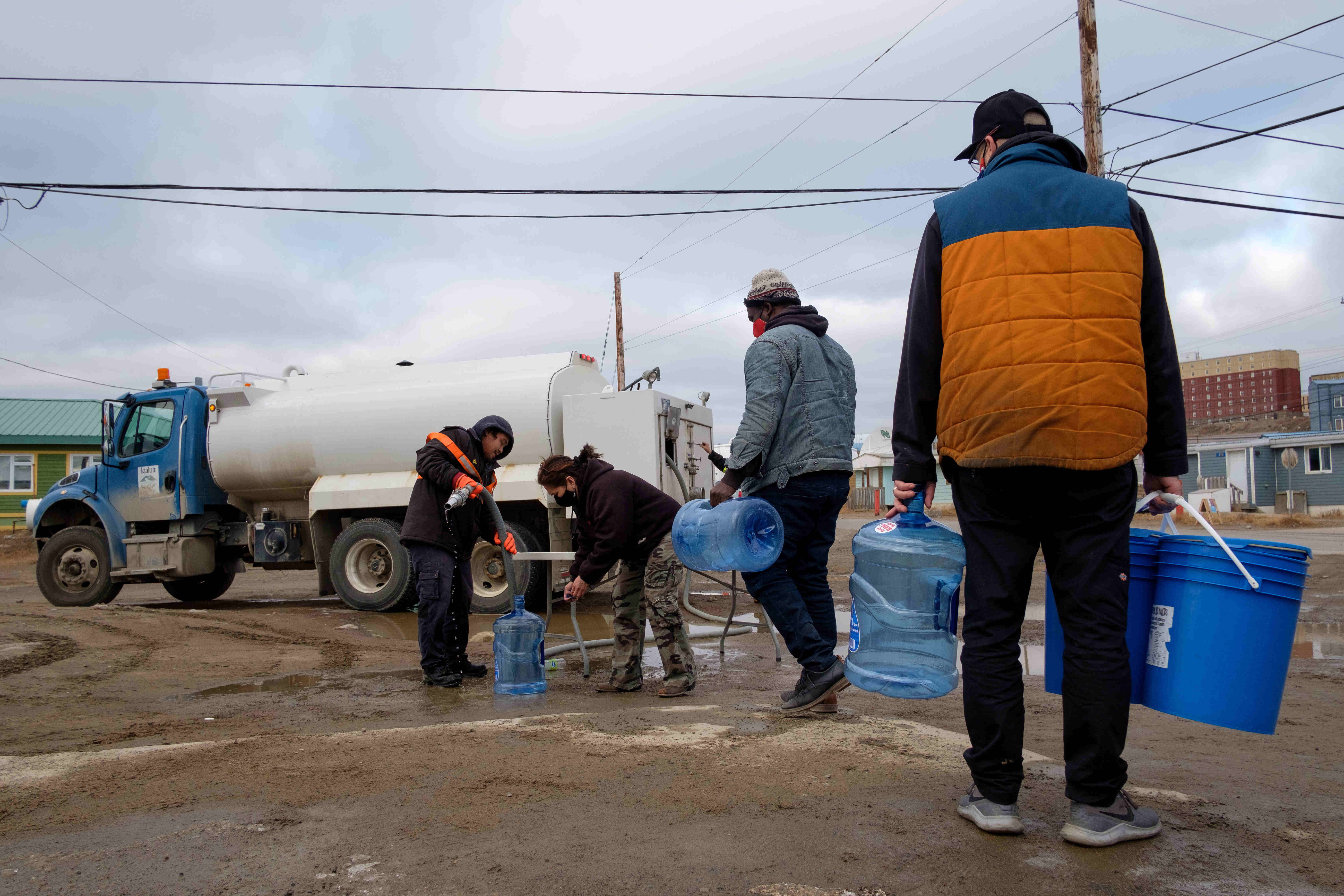 当地时间10月15日,加拿大努纳武特发生高浓度燃油污染饮用水事件,民众排队领取瓶装水。图片来源:澎湃影像