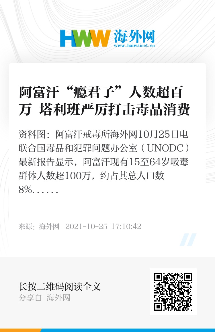海外网10月25日电 联合国毒品和犯罪问题办公室(UNODC)最新报告显示,阿富汗现有15至64岁吸毒群体人数超100万,约占其总人口数8%,为世界平均水平的2倍。塔利班自8月15日上台以来,严厉打击贩毒和吸毒行为,还专门部署巡逻队,在街上拘捕吸毒人员。